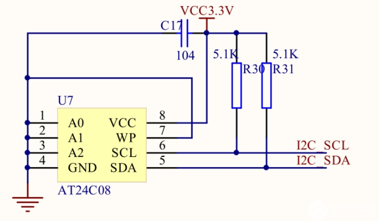 我现在使用的开发板上AT24C08的原理图是这样的: