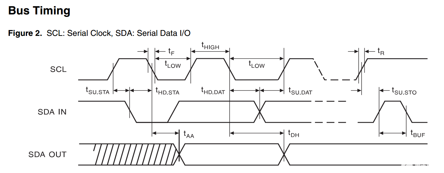 总线必须由主机(通常为微控制器)控制,主机产生串行时钟(SCL)控制总线的传输方向,并产生起始和停止条件。