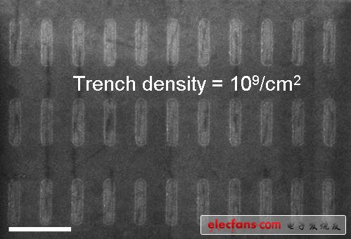 碳纳米管阵列显微图像:横向间距200纳米,纵向间距500纳米,密度每平方厘米1亿个(白色尺度条400纳米)