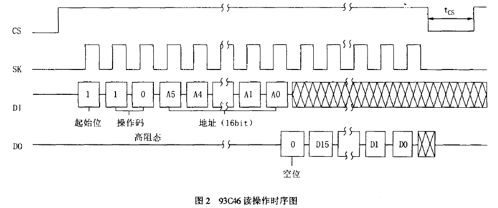 93CA6作为从设备,其SPI接口使用4条I/O口线:串行时钟线(SK)、输出数据线DO、输入数据线DI和高电平有效的从机选择线CS。其数据的传输格式是高位(MSB)在前,低位(LsB)在后。93C46的SPI总线接口读命令时序如图2所示。