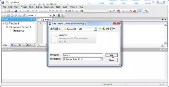 4、双击需要添加的文件main.c,或者选中它再点击Add按钮,从左边的Project窗口就可以看到,文件就已经被添加到工程中了。这时弹出的窗口并没有关闭,因为这样可以方便继续添加其他文件。因为我们现在只需添加一个文件并且添加好了,所以点击Close关闭弹出的窗口。