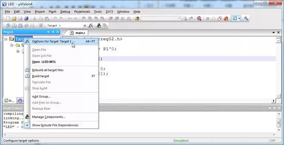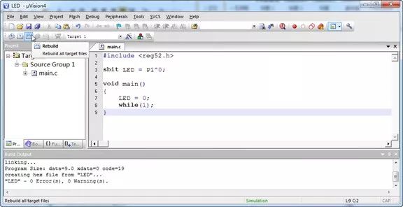 2、点击左上方的双箭头按钮编译全部文件,我们看到下方的输出窗口显示编译完成,“creating hex file from ‘LED’”表明已经编译时创建了HEX文件(HEX文件是十六进制文件,将烧写进单片机。相当于Windows中的可执行文件“.exe”),“0 Error(s), 0 Warning(s).”表示编译成功,程序也没有语法错误。如果提示你的程序有错,请细心的检查一下,有没有发生漏掉分号等情况。