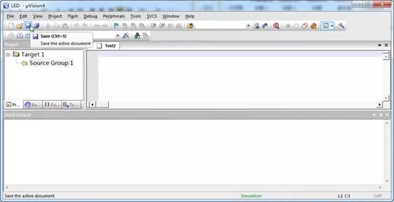 2、然后我们点击保存按钮,将其保存到工程文件夹Project01 – LED中,保存为扩展名是“.c”的文件,如main.c。这里大家要注意的是,源文件其实只是一个普通的文本文件,不过扩展名是c而不是txt。我们刚刚新建main.c文件的操作,也可以通过在资源管理器中新建文本文档,然后重命名为main.c的方式进行。