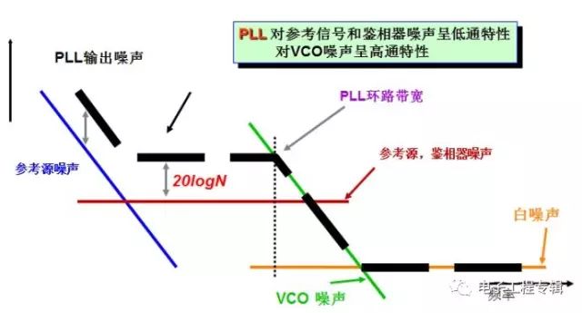 对参考源,PLL为低通特性,带宽为环路带宽。PLL输出相噪是参考信号相噪按N倍频恶化。N越大,PLL输出相噪指标越差。在环路带宽外,PLL输出相噪由VCO决定。