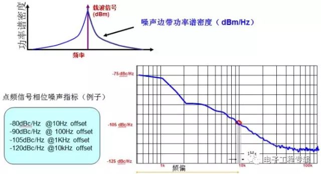 相位噪声指标主要在频域上进行描述,用一定频偏(offset)下单边带(SSB)噪声功率谱密度与载波功率比值来表示。工程上考察的频偏范围为:10Hz~ 1MHz, 频偏横座标用对数表示。