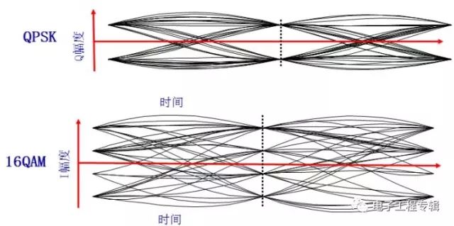 眼图以无限持续的方式反复显示I和Q幅度对时间。I和Q转换可单独显示,在确定符号的时刻形成“眼睛”。QPSK有4个不同I/Q状态,各在一个象限。I/Q各有两个电平,对每个I和Q形成一个眼睛。下面一张图是16QAM的例子,4电平围成3只眼。重要的是理解眼图的概念。好的信号具有“张大”的眼睛,交点对应星座图上符号点位置,调制质量越高,交点越集中。