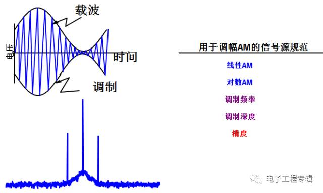 信号源的频率精度与参考振荡器的年老化率及校准之后经历的时间有关。 实际正弦波的信号特征比理想信号要复杂的多,需要考虑相位噪声,寄生调频,杂散,如图4所示。相位噪声在频域反映为噪声边带,在时域上反映为随机的相位抖动,可理解为有随机的噪声对理想正弦信号进行调相。