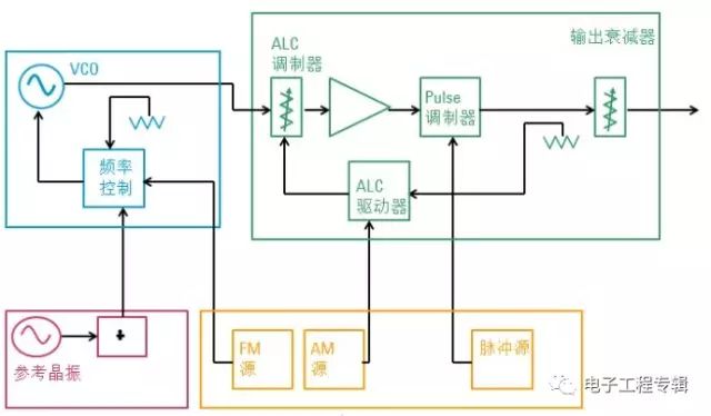 信号源利用ALC(自动电平控制)威廉希尔官方网站 来保证输出信号的幅度。大范围幅度调整由衰减器完成。