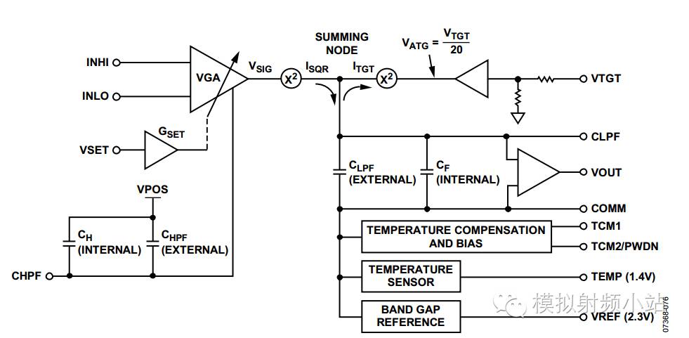 RMS detector(有效值检测器)基于平方电路来获得输入信号的功率大小。其相对于LOG来说一个重要的不同就是这种方案检测到的输入信号功率不受单音信号,宽带信号以及调制方式的影响。其典型的电路框图如下所示。