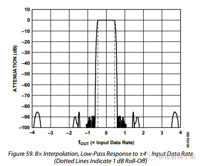 现代通信中越来越多地采用IQ信号,采用IQ的优势大致来说有两点,一个是可以获得更宽的信号带宽,另一个是具有更好的镜像抑制能力。从图中可以看到AD9779A支持最高8倍内插,并且增加了复数调制使得信号频点可以以1/8FDAC的步进移动。同时为了获得更好的带内平坦度增加了SINC-1滤波器以补偿DAC本身频响的滚降。