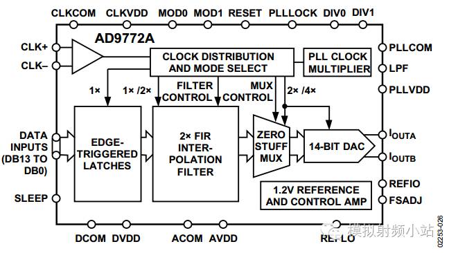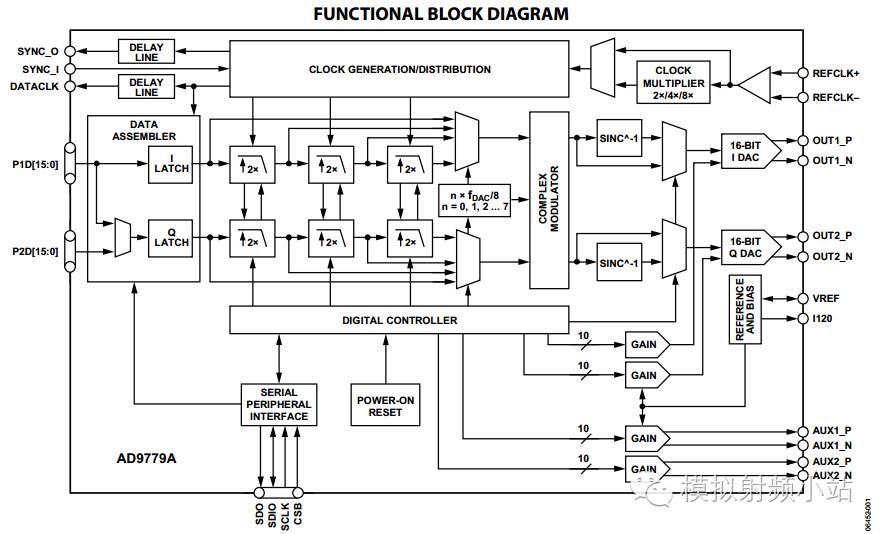 随着威廉希尔官方网站 的发展,高速DAC中支持的内插倍数越来越高,同时增加了更多的调制和滤波功能。如下图所示的AD9779A的框图。