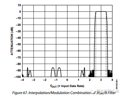 上图对应的是高通2倍插值的原理和效果图。高通2倍插值为异相插值。使得基波信号被抑制,保留镜像信号。该结果很适合使用在IF发射上。使得能在接口速率很低的情况下是信号经过DAC后被搬移到一个IF上。