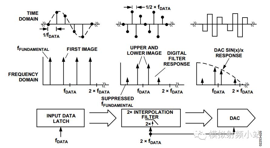 这里我们以一款较老的DAC产品AD9772A为例。在框图中可以看出存在x2内插和补零。对于两倍内插有两种类型:低通内插和高通内插。下图为低通2倍内插原理和效果图。