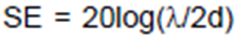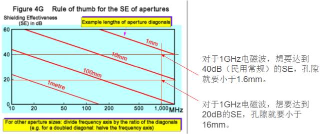 在一个完美的屏蔽壳体上开一个洞,相当于构成一个半波共振缝隙天线,屏蔽效能SE与孔的最大尺寸d、电磁波波长λ关系如下:
