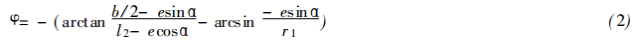2)当 180°≤α≤ 360°时因对称关系, 将- α, - φ代替( 1)式中的α , φ即可得到 180°≤α≤ 360°时的极坐标方程: