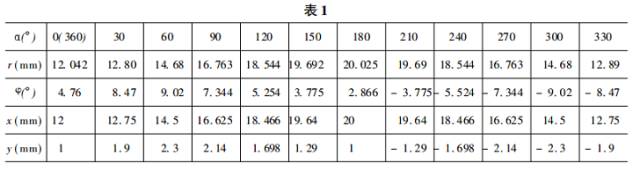 经计算 e = R - r 1= 4 mm, l 3= 16 mm参数 α从小到大顺序取值到r 和 φ的对应值见表 1。