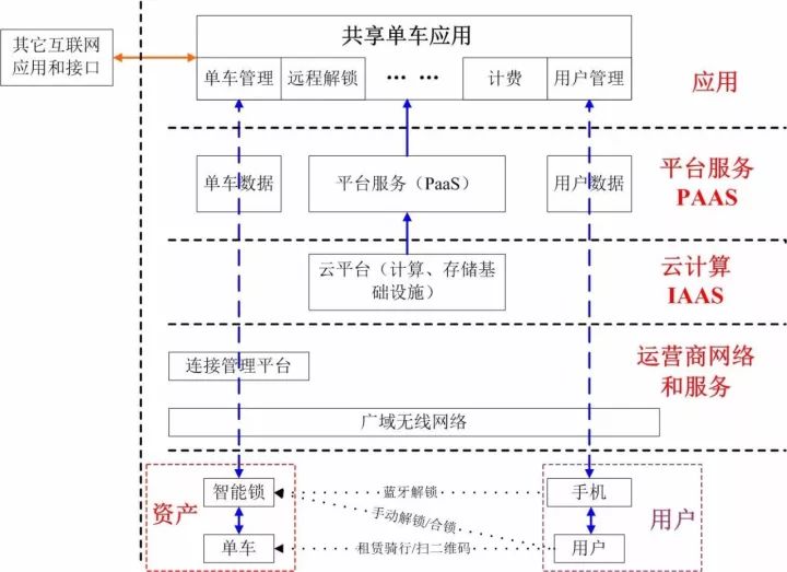 云端应用需要采集、存储并管理两类关键数据:单车数据(物联网特性的资产数据:包括单车的通信连接状态、车锁状态、使用记录等),单车数据由智能锁通过通信模块和SIM卡,经过电信运营商的网络以及运营商的物联网平台,上传到共享单车的服务平台;用户数据(互联网特性的用户数据:除了用户基本信息、消费记录、用户账户和征信信息等,还包括用户的行为数据:骑行的路径和位置信息)。正如此文开头所述,共享单车是“物联网+互联网”应用,所以企业资产(单车)和用户数据是共享单车企业的核心资产。