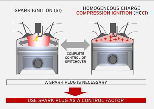 火花点火可以在高负荷条件下启动发动机,但并不会在任何预设的点切换至压燃模式。Hirose 解释说,当发动机到达进气边界条件时,燃烧室内将产生一个不断膨胀的火球。此时,由于点燃模式提供的额外压缩力,发动机的实际压缩比会高于约15-16:1 的几何压缩比,进而触发CI 模式。