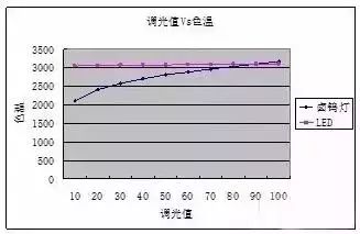 LED灯具与卤钨灯具调光过程色温变化对比如图3所示,可以看出LED灯具在调光过程中色温是不变的。