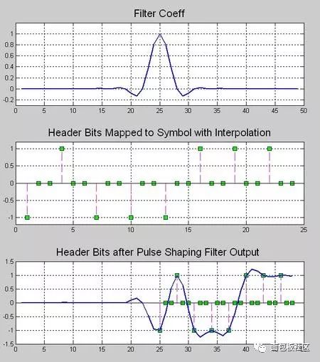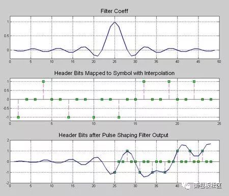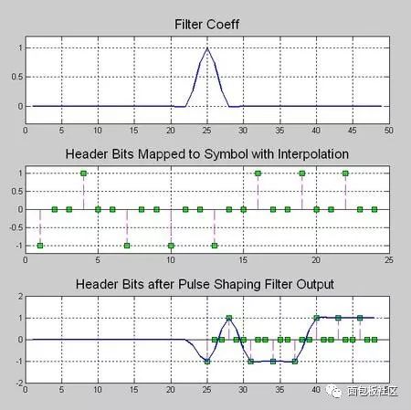 先找一个比较中庸的配置,滚降系数0.5,采样率是3倍的符号率,滤波器延迟是8(个脉冲符号),由于FIR是中心对称的,你可以看到,总共的抽头系数是3*8*2+1=49个,通过下面这张时域的图你可以看到滤波器冲击响应的时域波形,以及输入的信息比特被映射为幅度是+1、-1的脉冲串,并且,被做了补零插值当做滤波器的输入。然后,在滤波器输出信号中你看看,是否实现了采样点无失真呢(请关注那些幅度是+1,-1的样点)?这个时域的信号的原始信息比特是0x47,数字卫星标准中的著名帧头。噢,等等,你是否觉得有点眼熟,对了,其实数字化的成形滤波器就是一个多速率信号处理里面的插值滤波器,这个我们在之前的系列文章中是有讨论的。
