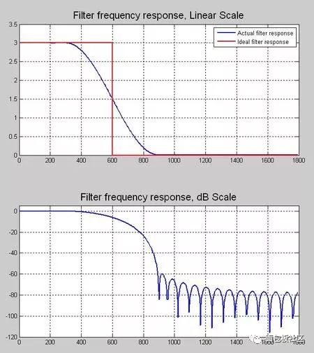 title('Filter frequency response, Linear Scale', 'FontSize', 16);legend('Actual filter response', 'Ideal filter response');subplot(2,1,2);plot(x_half_fs, f_rp_vec_norm_dB, 'linewidth', 1.5);grid on;title('Filter frequency response, dB Scale', 'FontSize', 16);ylim([-120, 5]);