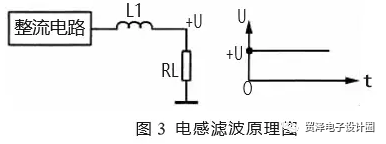图 3 所示是电感滤波原理图。由于电感 L1 对直流 电相当于通路,这样整流电路输出的直流电压直接加 到负载 RL 上。