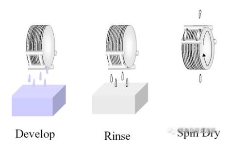 b、连续喷雾显影(Continuous Spray Development)/自动旋转显影(Auto-rotation Development)。一个或多个喷嘴喷洒显影液在硅片表面,同时硅片低速旋转(100~500rpm)。喷嘴喷雾模式和硅片旋转速度是实现硅片间溶 解率和均匀性的可重复性的关键调节参数。