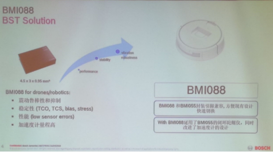 博世主推的高性能二合一方案BMI088,是工业机器人、家用机器人、社交机器人、扫地机器人以及平衡滑板车等市场不错的选择。其中16位陀螺仪通过车规验证,16位加速度计针对温度偏移系数做出优化。因此,它们具有低漂移,高震动鲁棒性和高温度稳定性等特点。BMI088和上一代BMI055封装引脚兼容,前者沿用了闭环陀螺仪,同时改进了加速度计的设计。