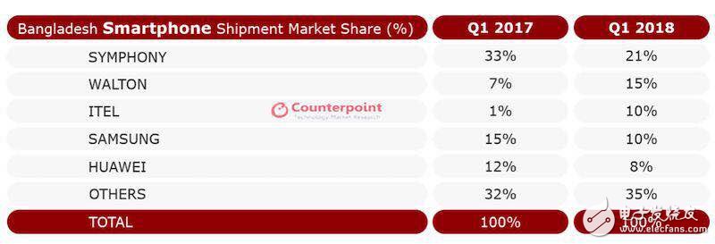 据国际知名调研机构Counterpoint 最新报告显示,今年第一季度,中国传音手机旗下品牌iTel 在孟加拉销量超越三星、华为,排名孟加拉第三。