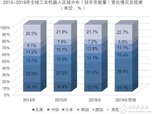 从全球工业机器人的年安装量变化情况来看,据IFR的统计,2016年中国安装量占比提升至31.0%,北美、日本、韩国和德国的安装量比重略有下滑。整体来看,2016年亚太地区依然是工业机器人安装量增量最大的市场。据IFR的预测,到2019年,中国安装量比重将进一步上升至38.6%。