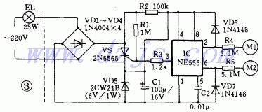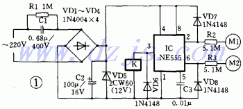 图2是延迟开关电路,555集成块接成单稳态触发器,平时处于复位状态,继电器K不动作。当M受到触摸时,电路被触发进人暂态,③脚输出高电平,继电器K吸合,被控电器工作。暂态时间t=1.1R2 X C4,暂态时间结束,电路翻转成稳态,继电器K释放,被控电器停止工作。