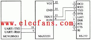 MC9328MX1提供了串行接口,使用RS-232标准接口,近距离通信系统中可直接进行端对端的连接,但由于MC9328MX1系统中LVTTL电路的逻辑电平与RS-232标准逻辑电平不相匹配,二者间要进行正常的通信必须经过信号电平转换,本系统使用MAX3221电平转换电路,以RS-232标准9芯D型接口为例,要完成最基本的串行通信功能,只需要RXD(数据接收)、TXD(数据发送)和GND(地)端即可。串行接口电路如图8所示。