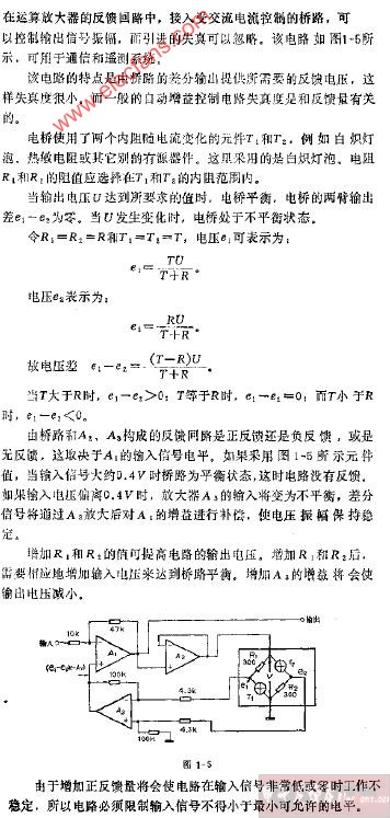 图中所示是用通用I型F005运放组成自动增益控制放大器线路.当输入信号变动较大,而想使幅度变小的时候,一