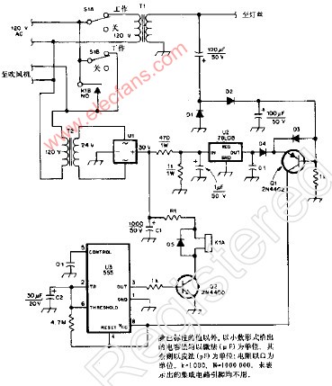 这里给出了音频放大器自动冷却器风扇的原理图。每当散热器的温度超过预设水平时,电路就会自动打开冷却器风扇。该电路将节省大量能量,因为当放大器以低音量运行时,冷却器风扇将关闭。在低音量下,热量会散发得更少,并且不会触发冷却器风扇的开启。