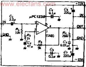 本电路使用的功率IC是日本电气公司生产的UPC1238,虽然直流输入特性比通用OP放大器差些,但作为一种功率OP放大器还是可以使用的。