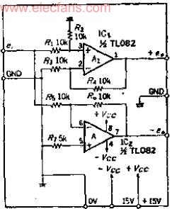 一提到平衡输出,人们往往产即想到在正相放大器输出端增加OP放大器以作为反相放大电路,正相和反相输出组成平衡输出。在直流电路中,虽可采用此方法,但如果是宽频带信号,反相放大器的相们漂移则成问题。本电路中由于OP放大器A1和A2的漂移量相等,所以即便输入频率发生变化也不会发生相位失真。