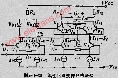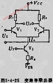 图5.4-25为变跨导乘法器原理图。它利用V1、V2管的跨导GM正比于恒流源电流IO,而IO又受另一个输入电压控制,而实