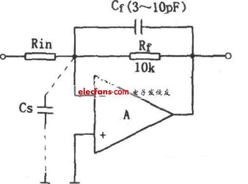 频率补偿电路图1是将OP放大器A,作为电流输人放大器,CT的可见负载电阻R,为0时的电路。由此电路可大幅度改善低频的频率特性,还有如要补偿低频域的增益,可插入反馈电容CF。