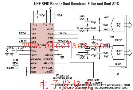 LTC6602 双通道带通滤波器是一种可编程的基频滤波器,适用于高效能 UHF RFID 读取器。在软件控制下使用 LTC6602 能够在单询问器物理设置时以高数据速率工作,或者以多询问器或密集询问