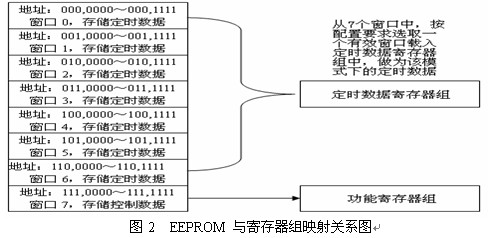 电路内嵌128×16 B 容量EEPROM存储阵列,把需要处理的数据做为一个最小项,把EEPROM空间按地址顺序分为8个16×16 B存储窗口。其中固定一个窗口为功能配置信息存储窗口,其余窗口为定时数据存储窗口。功能配置信息中设置一个“有效定时数据存储窗口”控制字,可以把一些常见固定的定时出具写入EEPROM某些窗口中,如果需要进行某种固定的定时时,只需要把功能配置字中““有效定时数据存储窗口”控制字进行改写,即可立即进行需要的定时功能。EEPROM与寄存器组映射关系如图2。