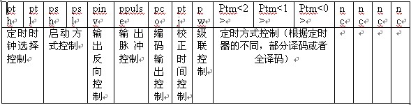 表1为定时器配置字,电路内每个定时器对应都对应一个定时器配置字,这样,可以根据应用定时要求,对三个定时器进行任一定时器的配置。同时要说明的是,定时器的启动方式配置和输出脉冲控制所定义的信号类型基本一致,这样就可以实现启动一个定时器定时完毕后立即启动另一个定时器的定时功能。