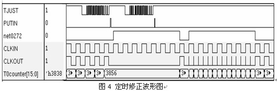 图5为定时修正波形图,从ADJUST端口输入具体修正时间,图中第一帧为定时增长7个时钟周期,第二帧为定时缩短7个时钟周期。CLKIN为定时时钟,CLKOUT为修正后时钟。T0counter[15:0]为定时器的数据。