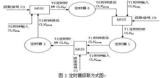 电路内含三个16位定时器,三个16位定时器之间进行一定规律的级联,以构成更大定时范围的定时器。配制方式如下图: