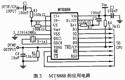 MT8888芯片是MITEL公司采用CMOS工艺生产的一种低功耗、高集成度的DTMF信号收、发芯片,它可以方便地与微机接口。