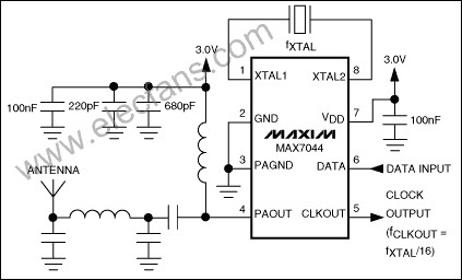The MAX7044 crystal-referenced phase-locked-loop(PLL) VHF/UHF transmitter is designed