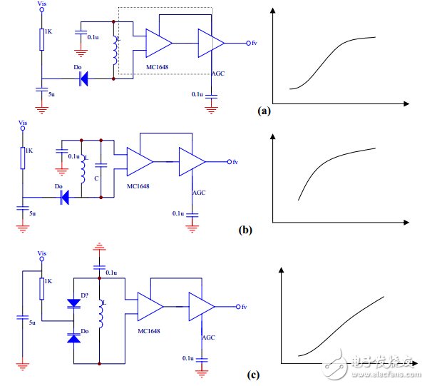MC1648是单片集成的射极耦合振荡器,输出MECL电平。电路工作时,外接电感L和电容C的并联谐振回路即可形成固定频率的振荡器。若外接变容二极管,控制变容管的直流偏置即可构成LC压控振荡器。MC1648的工作电源为5v或负5.2V。最高工作频率可达225MHz.几种常见的变容管连接方式和相应的压控特性见下图,其中(a)(b)为单管连接,控制电压加到变容管,其作用是限流。(c)采用双管背对背连接,其工作频率高,压控特性也好,本系统采用此种结构。电路的5端为AGC。改变AGC的电位,则振荡幅度改变,经放大输出的波形也不一样。通过AGC调节,电路可以输出正弦波,也可以输出方波。