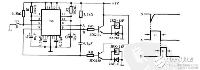 如下是由一片556(双555)组成的两级定时器电路,第一级定时器被开关S触发时产生延迟脉冲A驱动继电器K1, A的延迟时间 t1 = ~1.1 R1xC 1