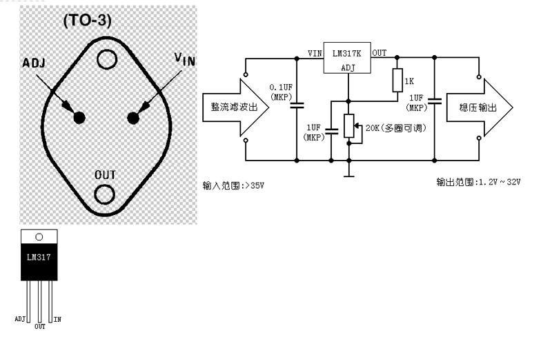LM117/LM317 的输出电压范围是 1.2V 至 37V,负载电流最大为 1.5A。它的使用非常简单,仅需两个外接电阻来设置输出电压。此外它的线性调整率和负载调整率也比标准的固定稳压器好。LM117/LM317 内置有过载保护、安全区保护等多种保护电路。