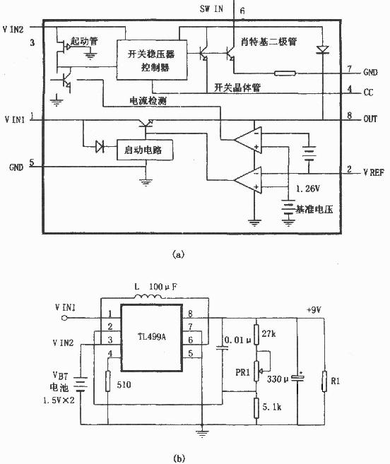 TL499A是一种可调式开关型稳压器,其输出电压在2.9~30V之间可调。TL499A不仅可用作开关稳压器,也可用作线性稳压器。图(a)为TL499A的内部结构框图。
