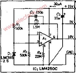 本电路中OP放大器仅作为同相放大器用,要使输出电压为+10V,电压放大倍数必须为4倍并且R3=R2(A-1),反馈电阻不能消耗功率,所以要取高阻值,R3=1.5M,R2=500K时,消耗电流为2UA。在LM385中,R1=500K,流过电流为25UA,OP放大器用限流电阻R4使电流减到数UA,整个电路4250是VOO=±1.5V也能工作的OP放大器适宜用电池驱动。